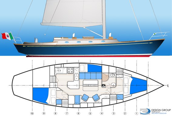 Il progetto preliminare di questo sloop è caratterizzato dalle linee classiche e da un layout interno dove , data la richiesta della committenza di soli quattro posti letto, si premiasse la qualità della vita di bordo. Nel sottocoperta troviamo, infatti ,oltre a due comode cabine, un ampio salone-pranzo con cucina aperta e zona carteggio. Il Layout inusuale per un imbarcazione di queste dimensioni testimonia l’attenzione per progetti fortemente personalizzati